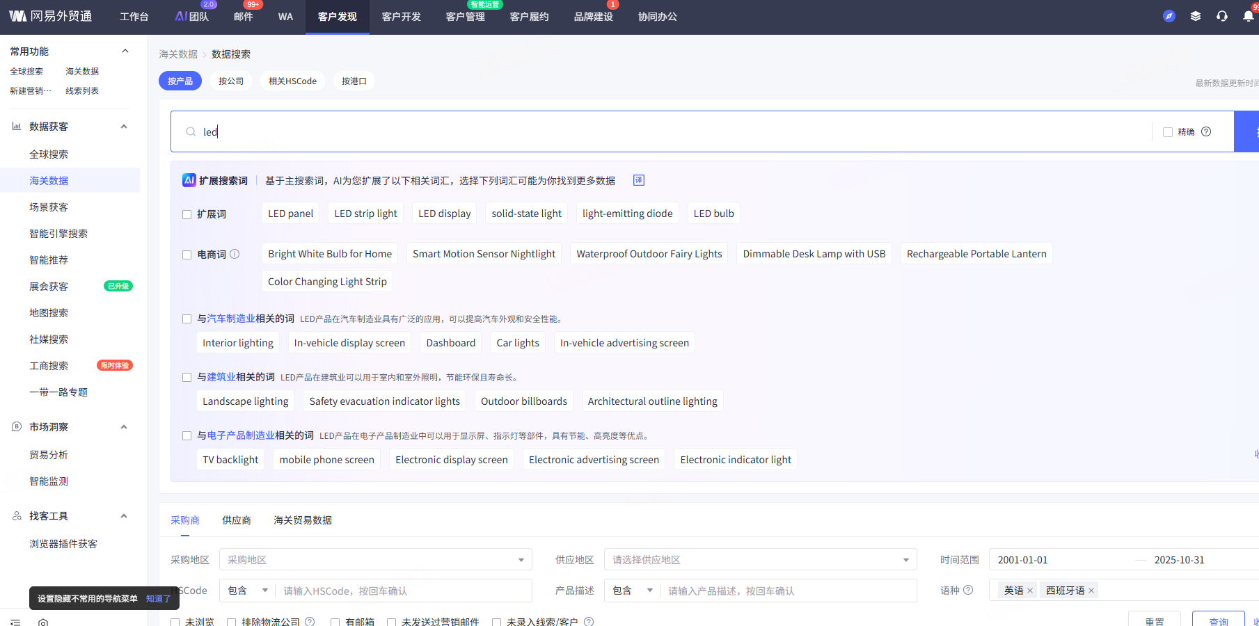 以LED品类为例,用户通过产品关键词即可锁定目标客户,点击公司列表就能查看企业HS编码、联系方式、社媒等核心基本信息。