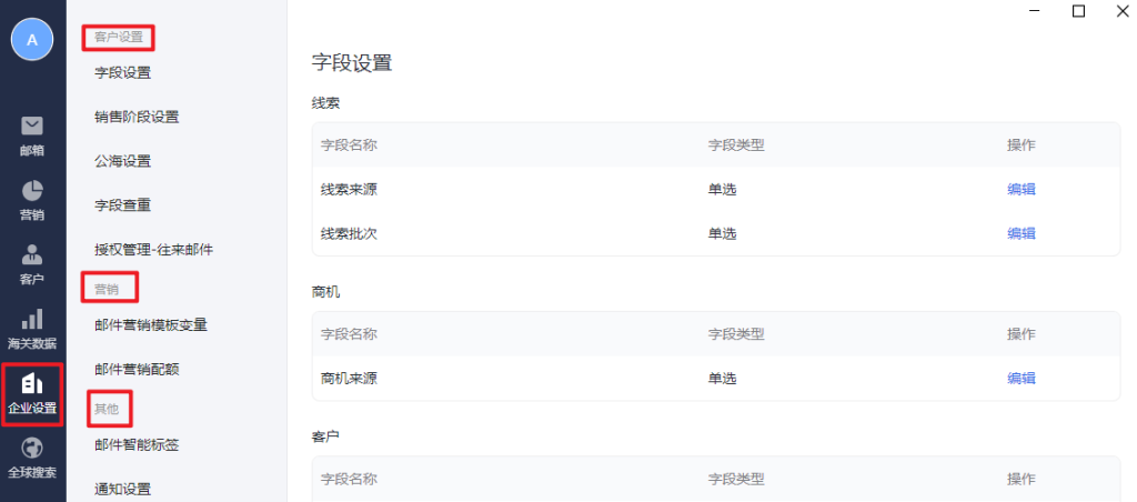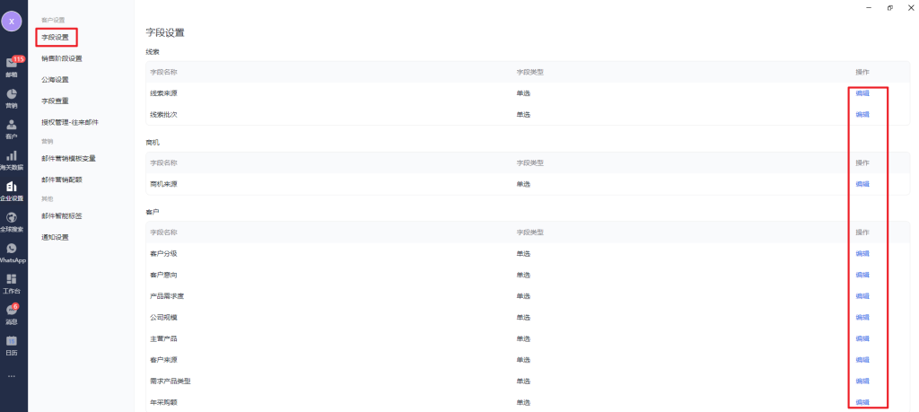 1.字段设置:字段设置主要针对客户这个模板的内容,可以点击最右侧的编辑,在这里自定义线索/客户/商机列表的一些字段显示,主要是便于区分客户,方便根据字段筛选,进行一键营销
