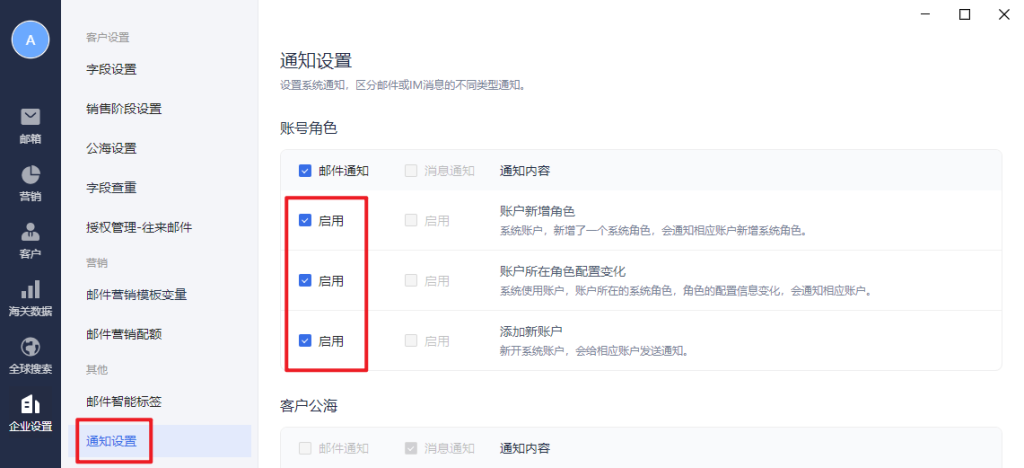 2.通知设置:启用后,在账户新增角色,所在角色配置变化以及添加新用户时,会有收到admin帐号发来的邮件通知