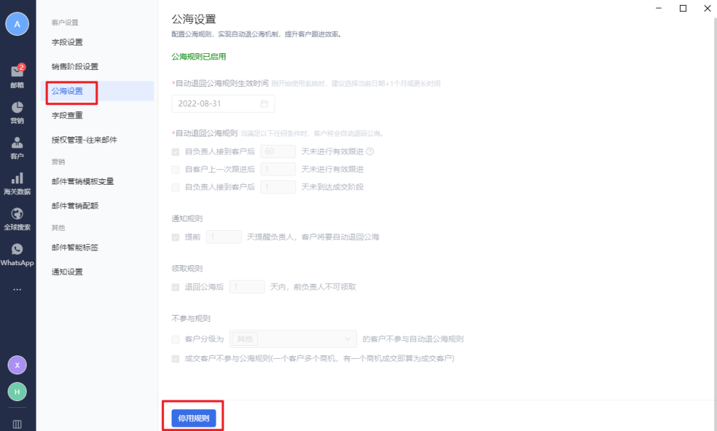 3.公海设置:针对客户公海进行设置的,可以在这里设置客户退回公海的规则,退回公海之前,哪个时间需要提醒客户对应的负责人,以及公海内客户的领取规则和不参与规则