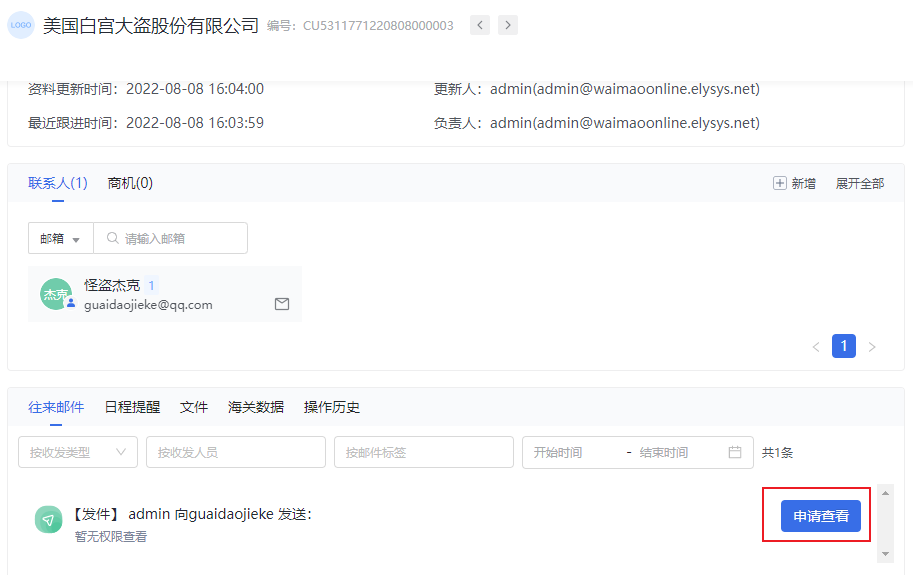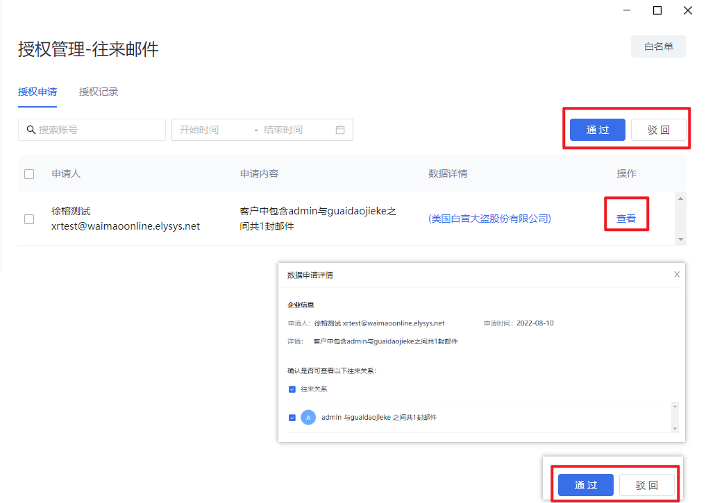 5.授权管理-往来邮件:子帐号向管理员申请查看其他帐号与客户交流的中的往来邮件