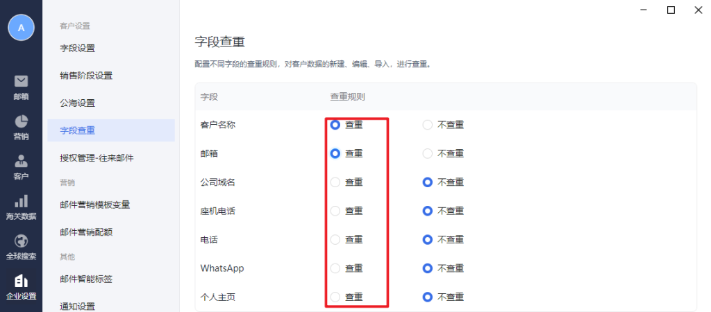 为了避免企业内成员重复对同一客户(目前查重只针对客户列表,线索列表不支持查重)进行营销而设置,可以选择需要查重的字段