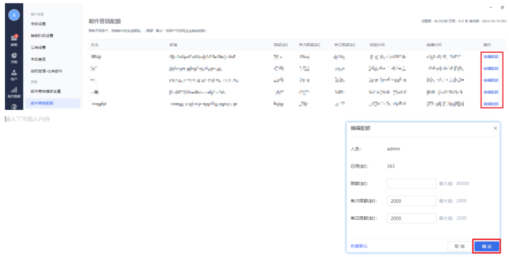 2.营销邮件配额:这里可以设置子帐号的发送限额,单次发信限额以及每日发信限,单日限额最大为2000,如果需要扩容可在售后群内联系,点击右侧编辑配额会弹出下方弹窗,设置好之后,点击确定,设置完成