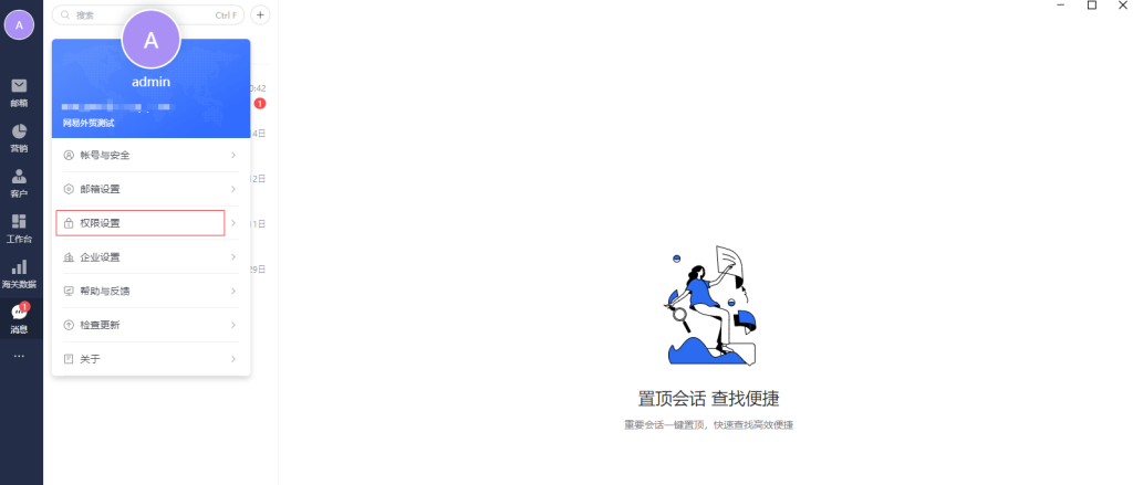 使用上一步配置的外贸通管理员,登录客户端后,即可进行权限设置(功能权限&数据权限)