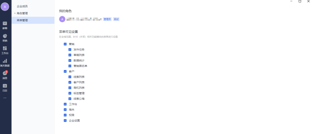 在全域范围,针对(外贸)相关功能模块的菜单进行设置。如取消勾选,则企业内所有用户都将无法看到对应功能入口。