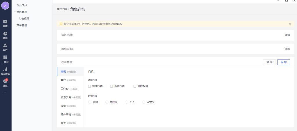 设置该角色不同业务模块的功能和数据权限。(支持业务模块:商机、客户、工作台、线索公海、线索、邮件营销、海关等)