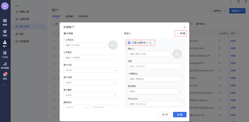一个客户可以添加多个联系人,点击“新增”可以新建多个联系人。且支持设置为客户主要联系人。