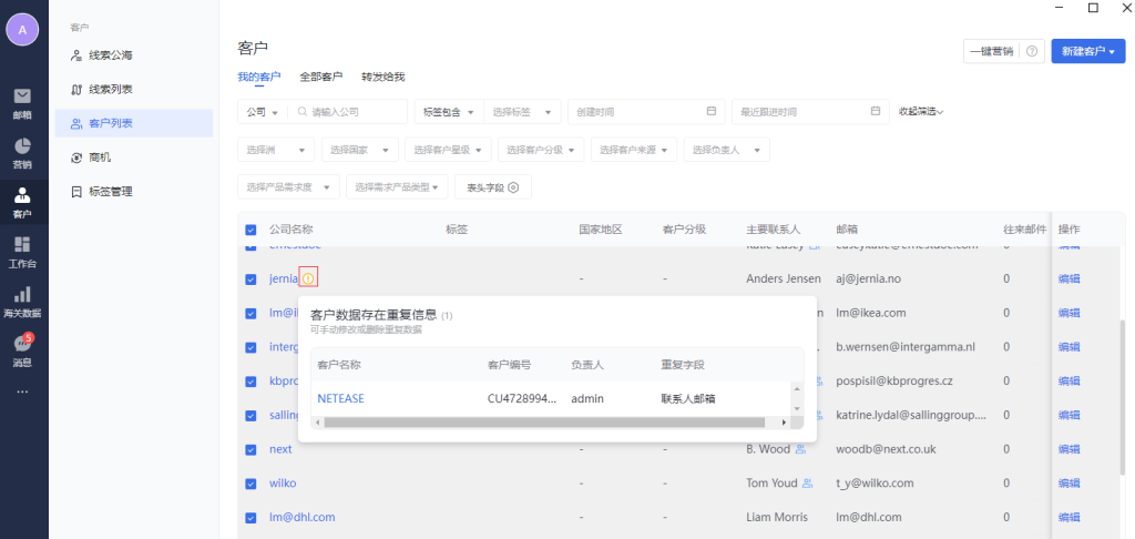 可以查看有“重复字段”的客户数据-重复字段校验:公司名称、公司域名、邮箱地址-显示客户名称、客户编号和重复字段