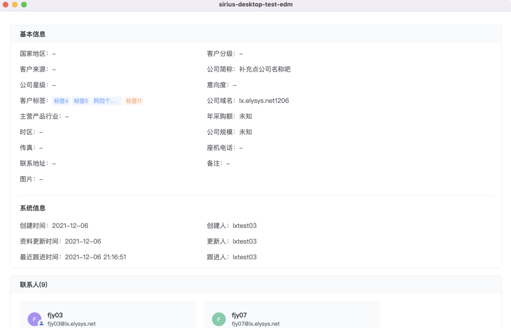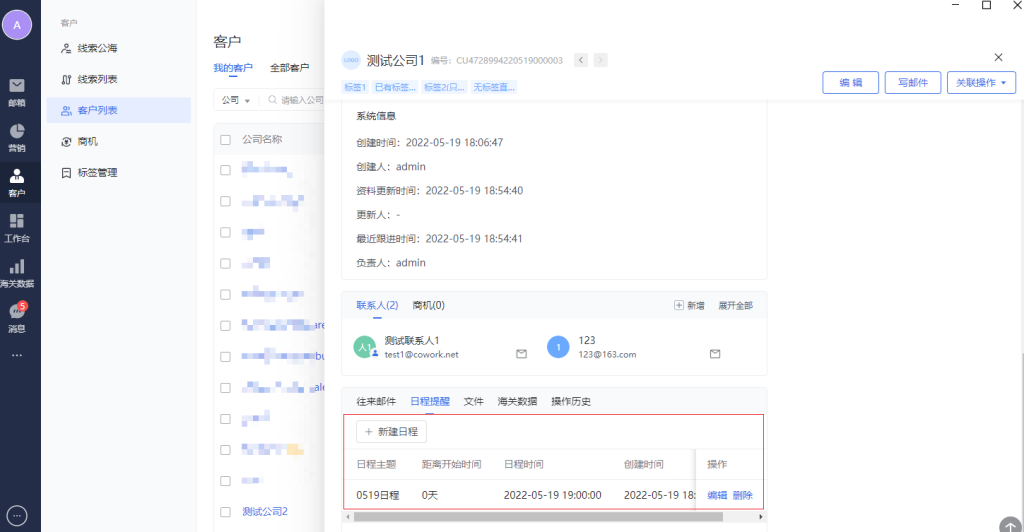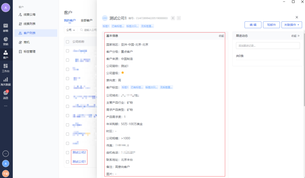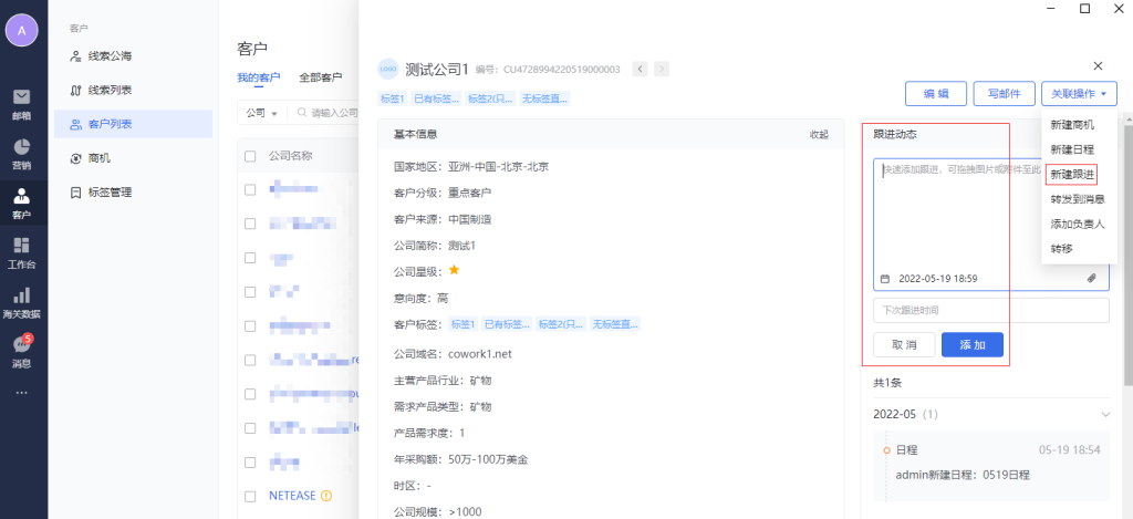 点击客户列表中的具体公司名称,会弹出客户详情页。