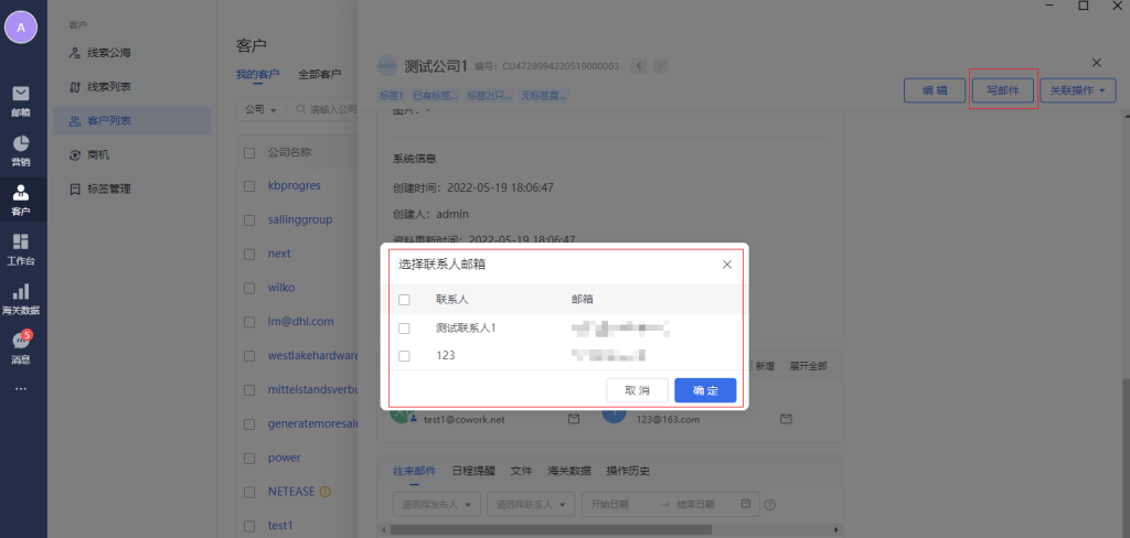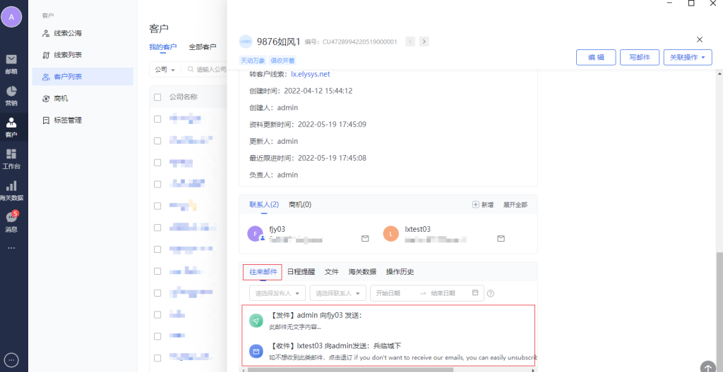 往来邮件的tab栏区域,显示客户联系人邮箱相关的往来邮件的记录。