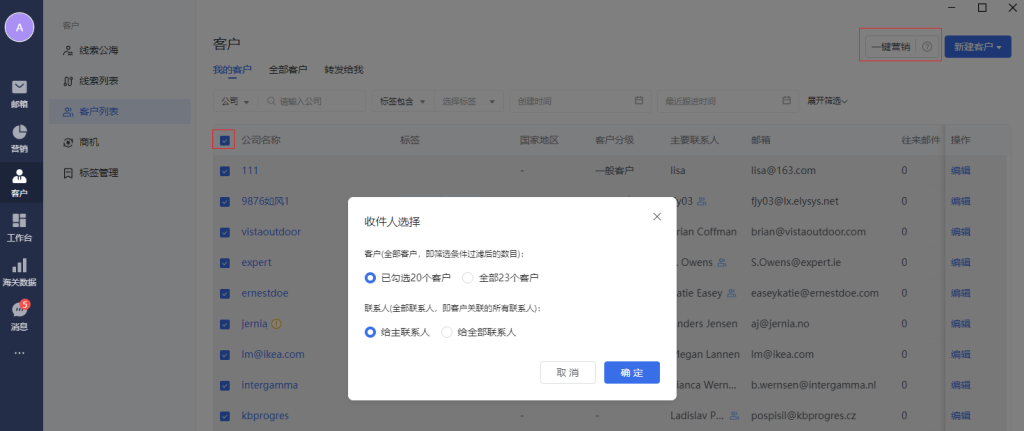 右上角“一键营销”按钮,可对列表页全量数据进行一键营销。点击后,会跳转到营销邮件页面,配置相关信息即可成功发送。