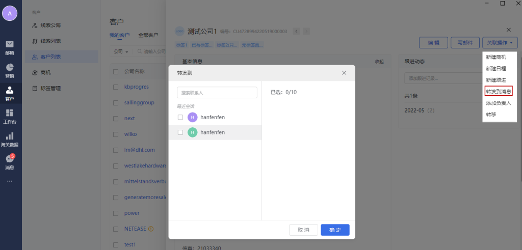 点击右上角的“转发到信息”按钮,可以选择通讯录中联系人,将客户信息转发到聊天中。