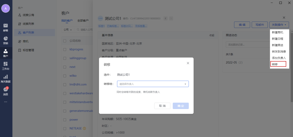 转移:转移客户数据给其他负责人,新的负责人可以进行跟进。
