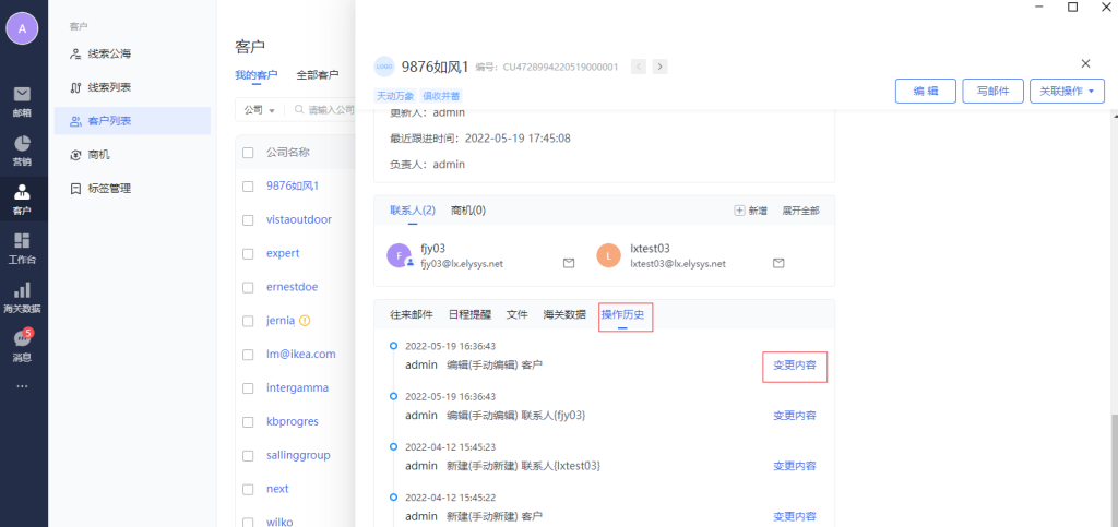 -操作历史的类型:新建(往来邮件推荐)、新建(个人通讯录导入)、新建(EDM收件人)、新建(手动新建)、新建(批量导入)、编辑(完善资料)、编辑(手动编辑)、删除 联系人、合并客户。