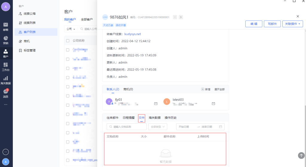 聚合客户的往来邮件、跟进记录里面的文档附件,沉底企业数字资产。-来源:与客户联系人的往来邮件、跟进记录里面的文档附件等-检索和筛选:文档名称搜索、类型筛选、时间筛选(开始时间-结束时间)