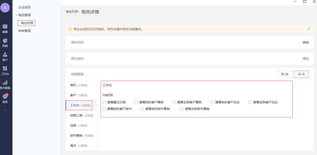 外贸管理员,点击头型-权限设置。可以通过角色权限里面的“工作台”,配置不同角色可以看到的卡片内容和类型。