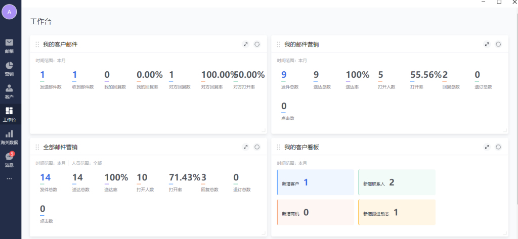 我的客户邮件:过滤邮件的收/发时间,统计线索、客户、商机关联联系人的收/发件等数据。