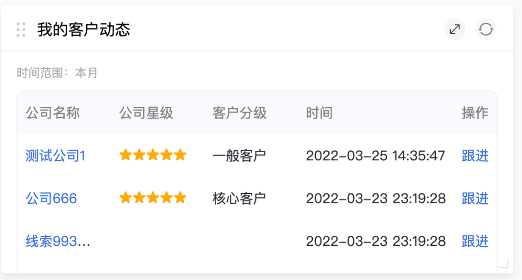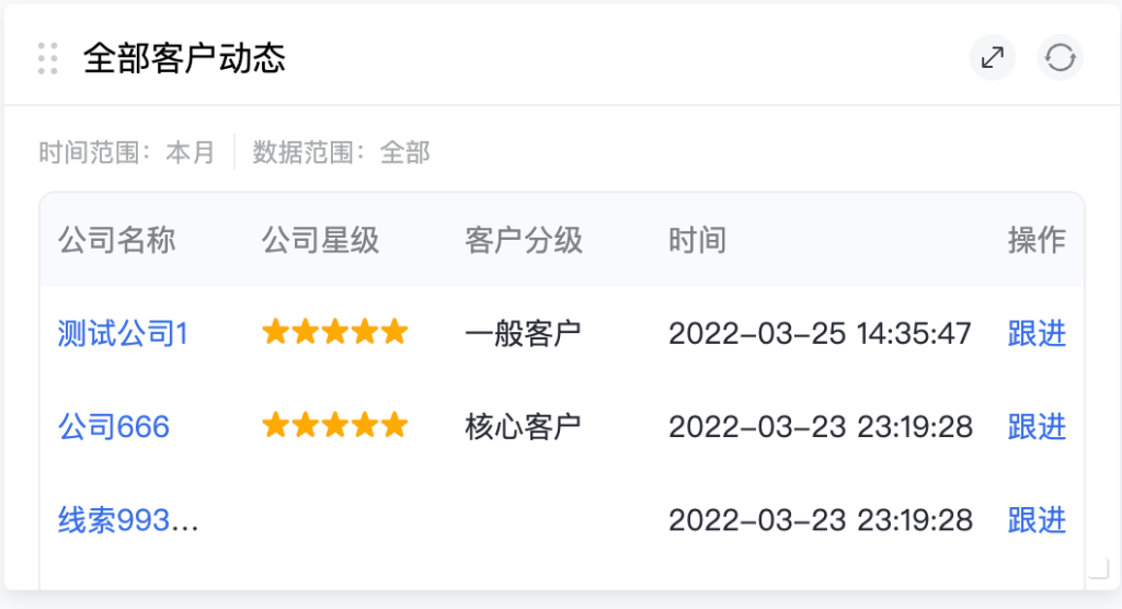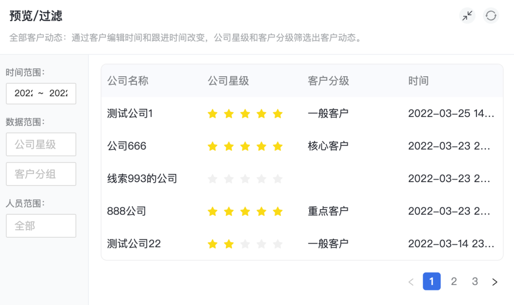 全部客户动态:通过客户编辑时间和跟进时间改变,公司星级和客户分级筛选出客户动态。