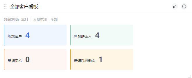 全部客户看板:查看数据创建时间范围内,新增的客户、联系人、商机、跟进动态