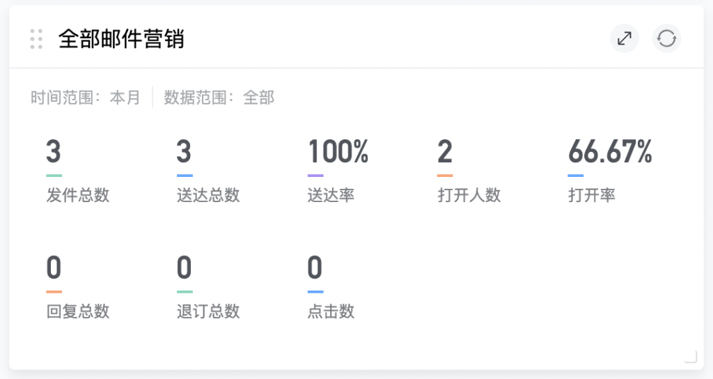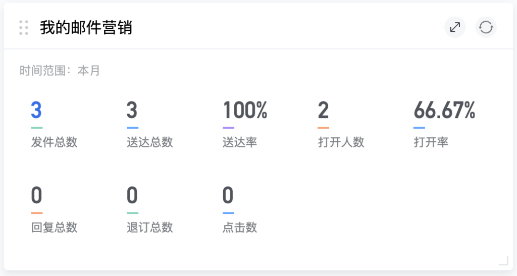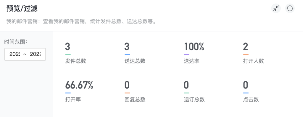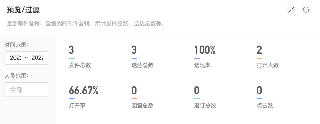 -指标统计:发件总数、送达总数、送达率、打开人数、打开率、回复总数、退订总数、点击数