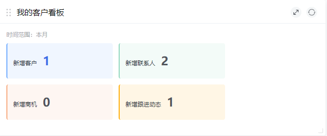 我的客户看板:查看数据创建时间范围内,新增的客户、联系人、商机、跟进动态