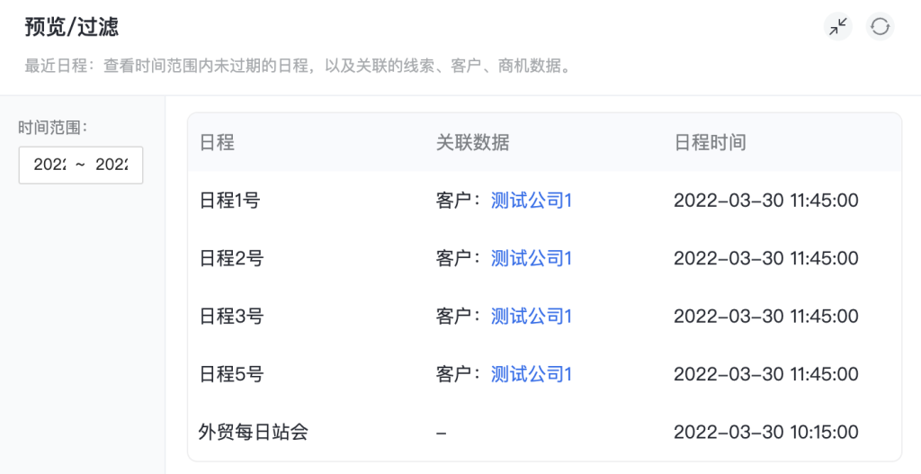 最近日程:查看时间范围内未过期的日程,以及关联的线索、客户、商机数据。