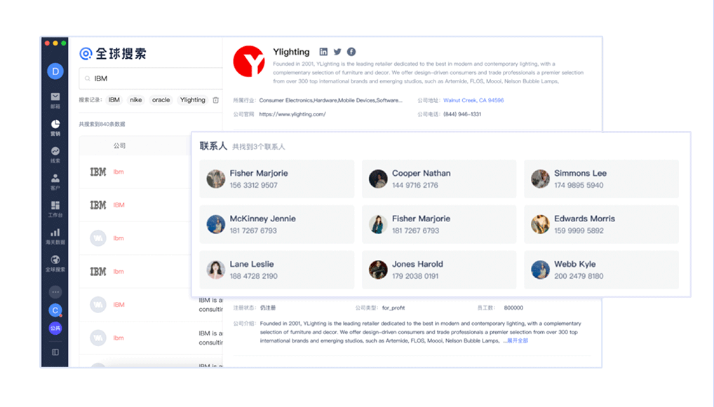 用户可以通过公司名称等关键字进行查询,简单直观的找到潜在客户的详细信息,更全面地感知目标客户画像,触达全球各个角落的商机,获客效率大大提高。