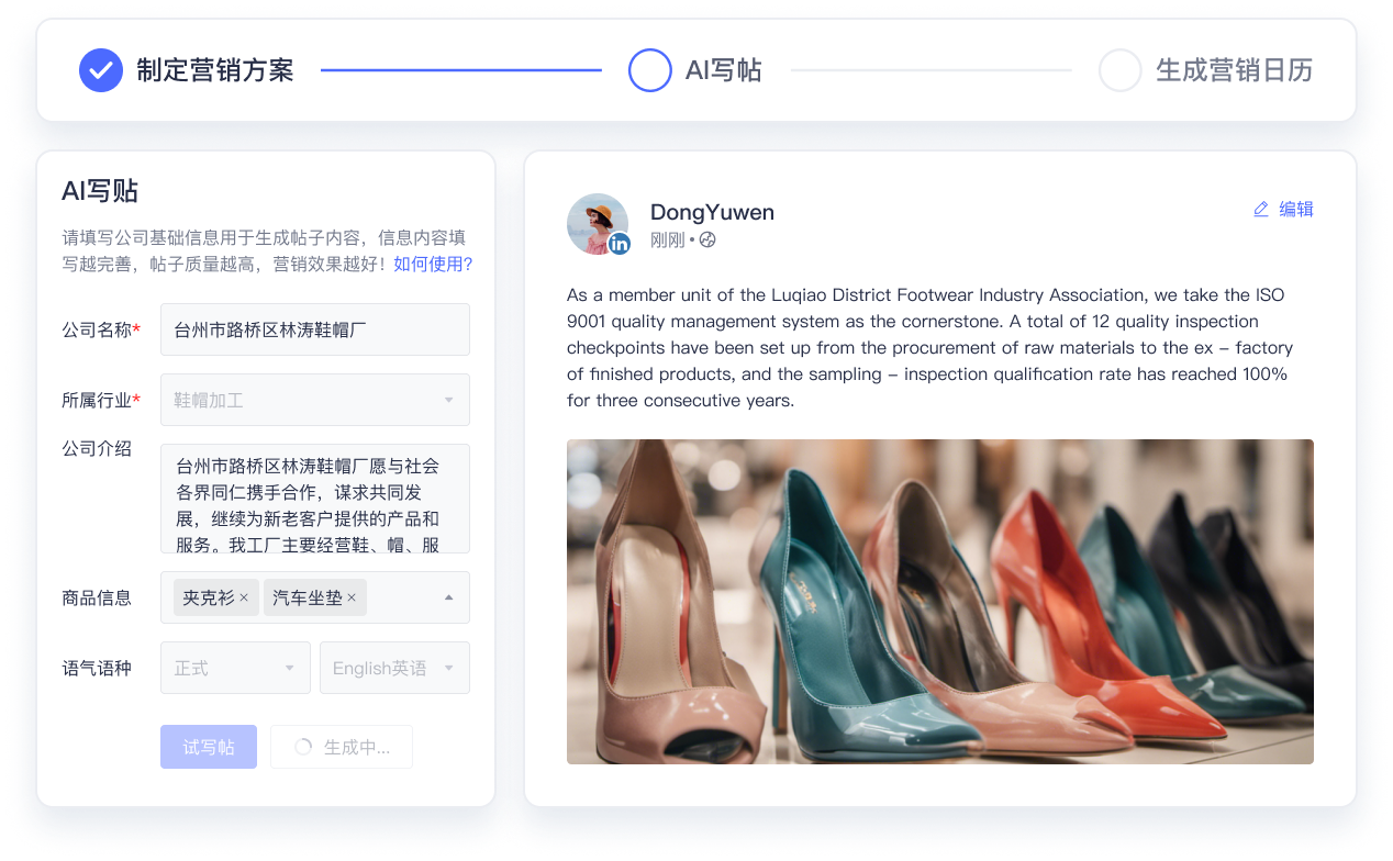 根据企业提供的关键词和主题,Al自动生成海外社媒平台高质量的帖文并发布,保持品牌信息活跃度、提升日常产品营销效果