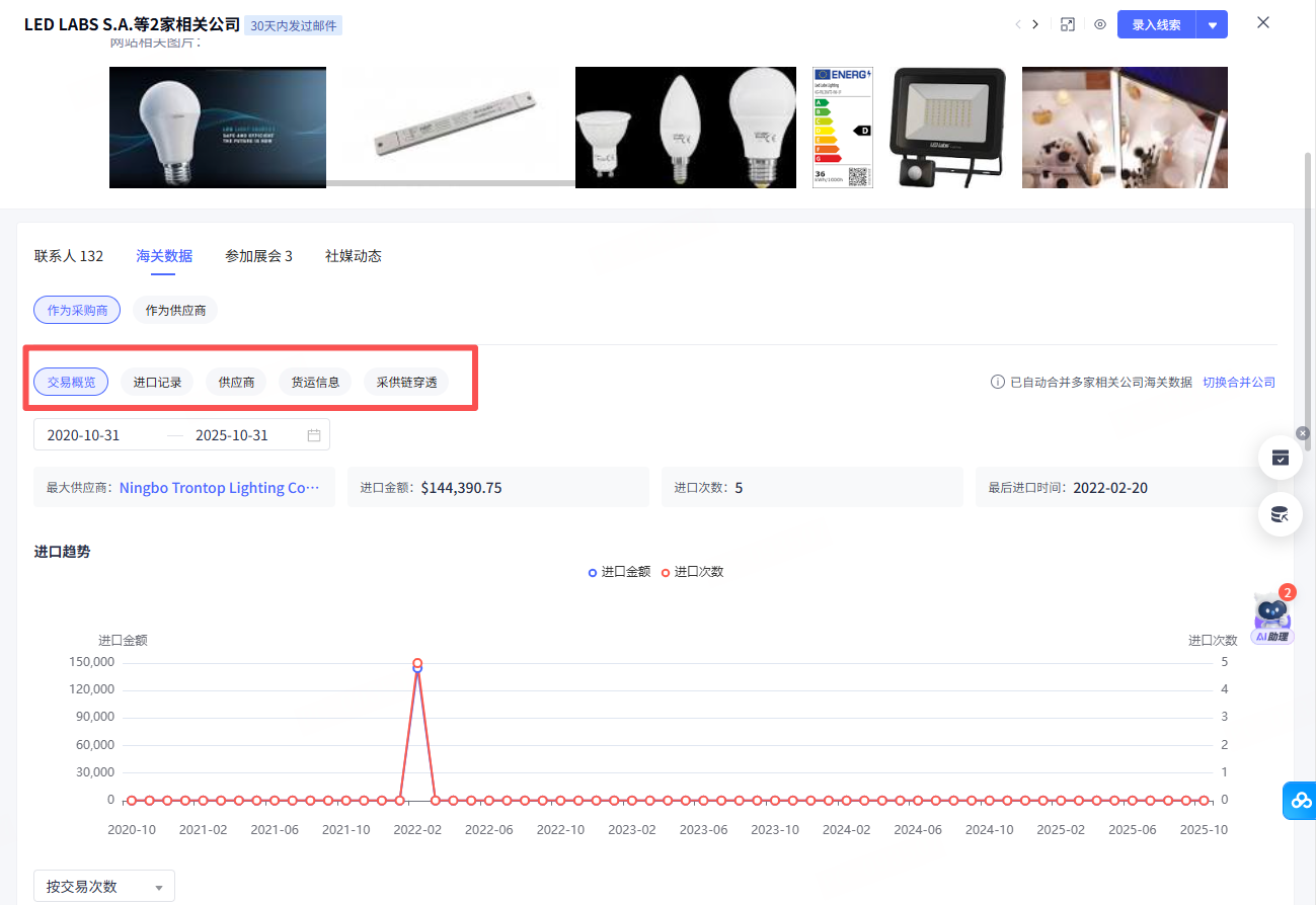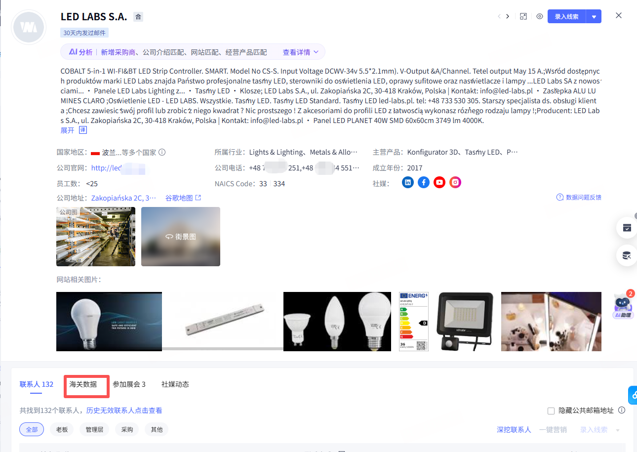 以LED品类为例,用户通过产品关键词即可锁定目标客户,点击公司列表就能查看企业HS编码、联系方式、社媒等核心基本信息。