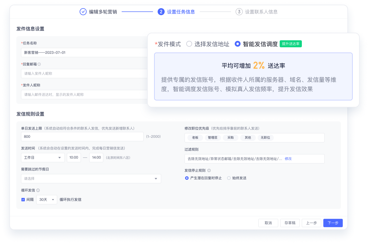 第三步:设置任务信息最后,进行发送配置,确保营销稳定、合规、高效地送达。