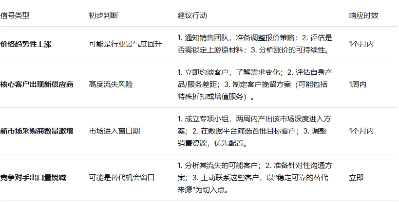 如何过滤噪声:关注的是“结构性”变化,而非单次异常。一个新供应商出现后,是否在后续月份持续有订单,是判断其是否为真正威胁/机会的关键。