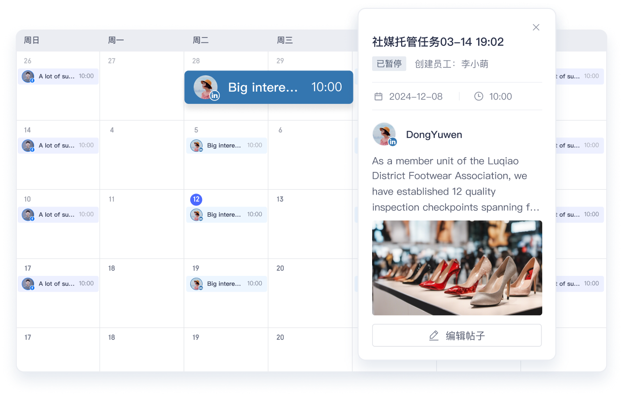 根据不同社媒类型,智能生成社媒发帖计划,并在日历中记录,全盘了解运营动作